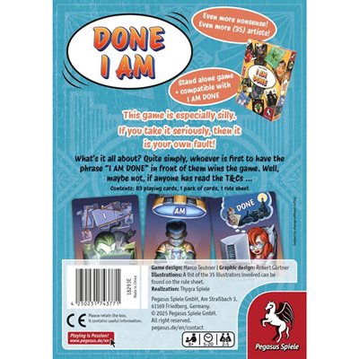 The crazy card game is back with new cards and even more silliness! DONE I AM can be played stand-alone or in combination with the cards from I AM DONE.