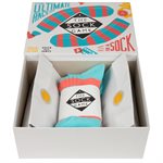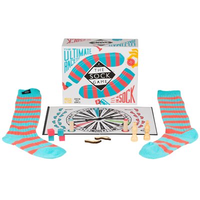 In The Sock Game, two teams compete to grab all the right items first — but it's going to be tough to find what you're looking for as each team has a large fluffy sock that has thirty tiny items stuffed inside it. On a turn, someone spins the spinner to see what the active players need to grab, then those people start digging. Whoever finds it first scores a point, and whichever team scores eleven points first wins (as long as they're beating the other team by at least two points).