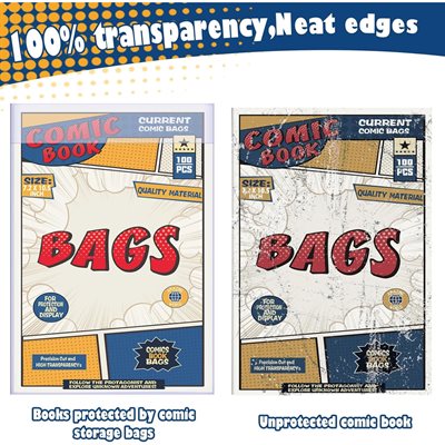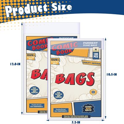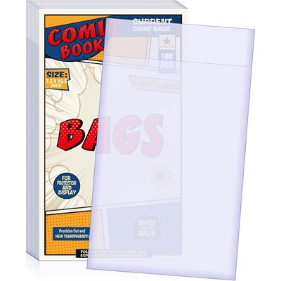 Ultra clear, archival-safe comic bags designed to fit Current size comics. Bag dimensions are 6-7/8" x 10-1/2". 100 per pack, acid-free and no PVC.