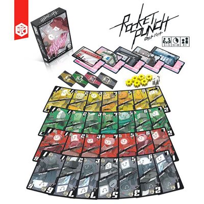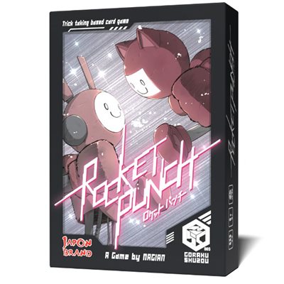 Rocket Punch! is a trick-taking game where the timing to take the belt is important. On your turn, you play the robot cards in your hand, and the strongest robot wins the battle and gets the belt. The round ends when you run out of cards in your hand, and the gym that owns the belt at that point receives fame points. The player who reaches the specified number of Fame Points first is the winner.