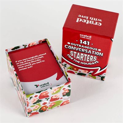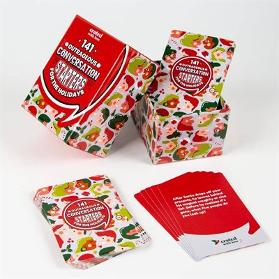 141 OUTRAGEOUS CONVERSATION STARTERS FOR THE HOLIDAYS - No more boring or awkward conversations around the dinner table!This deck includes 141 unique, off-the-wall conversation topics for holidays. Break the mold of your typical conversations. These topics will help you learn more about your friends and family, connect more, and share a few laughs along the way! This deck makes the perfect gift for your next holiday or for someone you love! Game comes with: 141 Unique Conversation Starters for the Holidays. Our 141 Outrageous Conversation Starters for the Holidays deck comes with unique, thought-provoking questions designed to help bring you closer together to friends and family with a few laughs along the way. And no politics or awkward conversations either! Designed with your family in mind! Our 141 Outrageous Conversation Starters for the Holidays deck is specifically designed to increase engagement with family and friends with topics that allow you to learn more about each other with laughter in mind.