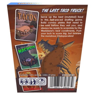 Serve up the best (mutated) foods in the fast-paced drafting game Tacopocalypse. Build combo plates that need to be sold before they eat you, and always be ready to scramble for the Wasteland's best condiments. Push your luck to score big, but beware the monstrous Chalupacabra!