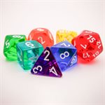 This set contains 7 Translucent Polyhedral dice with white numbers in the following shapes and colors: