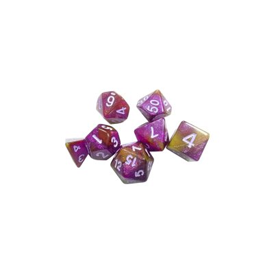 A set of sparkling standard-size Bloom Pink resin dice with gold numbering, including 4d6, 1d4, 1d8, 1d10, 1d00, 1d12, and 2d20.