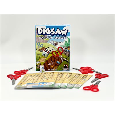 Digsaw is a family friendly, easy to teach and learn, roll-and-cut game where you can become what you’ve always dreamed of – an archeologist! In Digsaw, players roll dice and cut apart (with scissors) their dig sites (paper) to recover artifacts buried within the earth. However, doing so will require precise planning and a good strategy, as each artifact could shatter if not removed with careful attention. And with 5 progressively more challenging levels to attempt as well as solo play, only the best will rise to the top and gain the coveted position of senior archeologist.