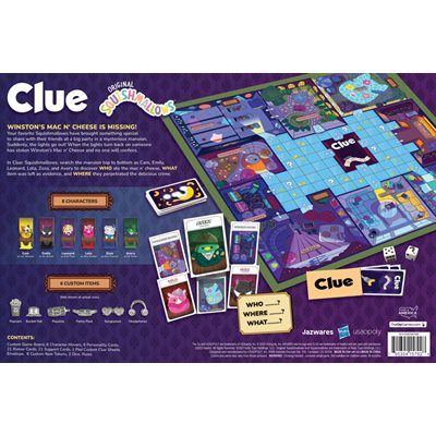 WINSTON’S MAC N’ CHEESE IS MISSING! Your favorite Squishmallows have brought something special to share with their friends at a big party in a mysterious mansion. Suddenly, the lights go out! When the lights turn back on someone has stolen Winston’s Mac n’ Cheese and no one will confess. In Clue: Squishmallows, search the mansion top to bottom as Cam, Emily, Leonard, Lola, Zozo, and Avery to discover WHO ate the mac n’ cheese, WHAT item was left as evidence, and WHERE they perpetrated the delicious crime.