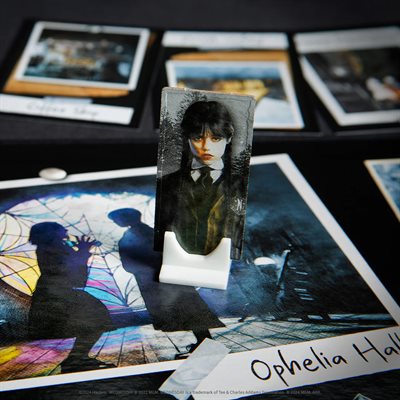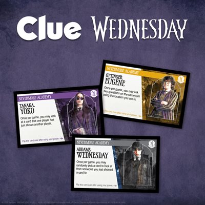 Standard clue, Wednesday tv show theme.There is more than the normal wolfing out and hiding from the sun happening among the outcasts at Nevermore Academy. The Hyde is attacking the students and townsfolk. Wednesday Addams has taken it upon herself to protect her friends, but can she?Taking on the roles of six characters from Wednesday, players will move around the game board featuring locations in and around Nevermore Academy and the town of Jericho. It is a race to discover where the hide will attack, what weapon they can use for its capture, and most importantly who will be the Hyde's next victim?All 6 playable characters (Wednesday Addams, Ajax Petropolus, Eugene Ottinger, Enid Sinclair, Yoko Tanaka and Biana Barclay) will start with a once-per-game unique ability that provides a special advantage over your opponents!Includes:Custom Game Board6 Student Movers6 Personality Cards21 Rumor Cards25 Intrigue Cards