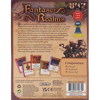 As ruler, it's up to you to build the mightiest realm in the world! Will you choose to follow military tactics and sweep away all in your path with a massive army? Will you turn towards sorcery and control an inaccessible island surrounded by impenetrable flames? The choice is yours, and no two realms will ever be the same in Fantasy Realms, a combo-licious card game.