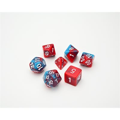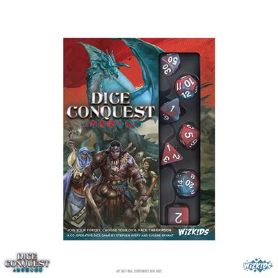 Dice Conquest is designed by Stephen Avery and Eugene Bryant, and features illustrations by Mirco Paganessi. It includes a beautiful set of 7 polyhedral dice, but players are also free to swap in their favorite set of dice instead!