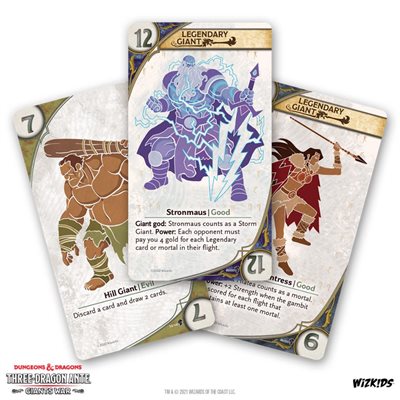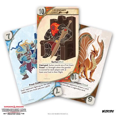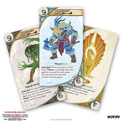 With over 100 new cards THREE-DRAGON ANTE: Giants War adds a whole new way to play the classic Dungeons & Dragons® standalone card game! You’ll mix in new Giant suits, while you split the stakes in two: the Dragon Stakes and the Giants Stakes. Players fight for the stakes where their flight is strongest, giving you new routes to victory!