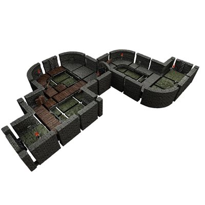 This WarLock set includes new double-sided sewer channel tiles and walkway tiles. Channel tiles depict murky sewer water on one side and stone tiles on the other and can be stacked to create a rising tide effect. Walkway tiles serve as narrow passages to avoid the murky sludge and have worn wooden slats on one side and stone tiles on the other. Additionally, this set has full-height grime-stained sewer walls that are curved inward to invoke the feel of an underground tunnel.