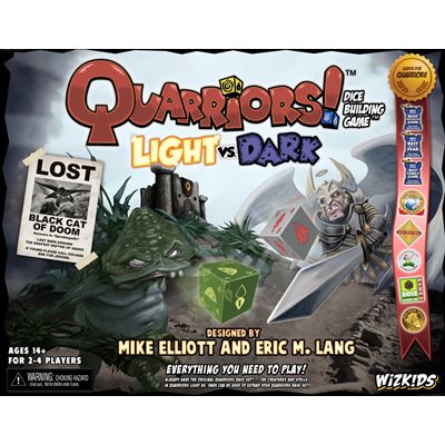 In Quarriors! Light vs. Dark, players take on the roles of Quarriors, mighty mystical warriors who have the power to capture dangerous quarry from the untamed Wilds! They must conjure the mysterious powers of Quiddity, cast powerful spells, and summon their creatures to battle if they hope to overcome rivals and earn their rightful place as the Champion!
