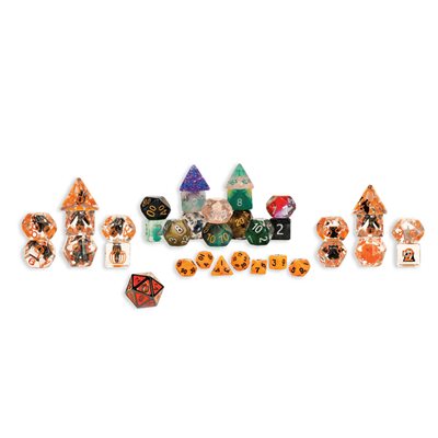 Cet immense coffret en forme de cercueil est parfait pour être exposé et est livré avec quatre jeux de dés complets ! Chaque calendrier comprend un mini jeu de dés, deux jeux de dés exclusifs en résine, deux jeux de dés assortis, un sac à dés sur le thème d'Halloween et un d20 en métal pour le dernier jour !