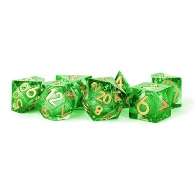Since the bubble in the liquid is constantly moving, we have not seen an effect on rolling. Sharp edge d4’s have small liquid cores that are more difficult to center, but we have not seen an effect on rolling. These full-sized polyhedral dice sets come with 7 dice (d4, d6, d8, d10, d10%(00-90), d12, and d20).
