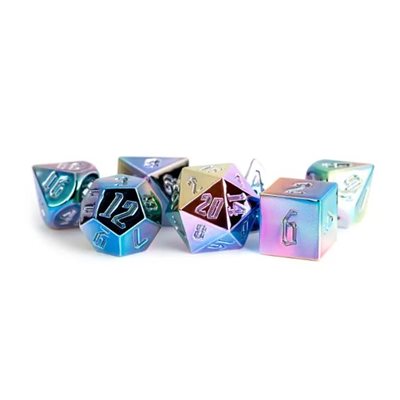 Rainbow Aegis Dice are a molded acrylic set, electroplated with a durable aluminum shield. This set offers the utility of resin dice, with the beautiful look and feel of metal dice. Each full-sized, 16mm set comes with 7 dice (d4, d6, d8, d10, d10% (00-90), d12, and d20).