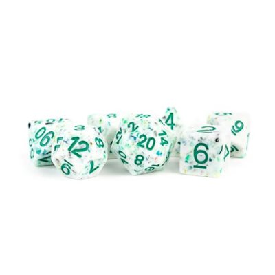 When dice are made, there are often defective dice and excess resin scraps. While scrap resin is often thrown away, we’ve decided to crush and recycle our resin remains to make these beautiful recycled dice! Each 16mm polyhedral set comes with 7 dice (d4, d6, d8, d10, d10% (00-90), d12, and d20).
