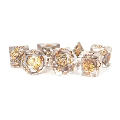 This set is infused with Gears! Its hard to beat the value in our resin dice sets. Beautiful and affordable, these are great Critical Reinforcers to our metal dice. Each 16mm polyhedral set comes with 7 dice (d4, d6, d8, d10, d10 (00-90), d12, and d20).