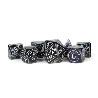 This set is infused with a beautiful blend of glitter. These are full-sized 16mm polyhedral dice sets that come with 7 dice (d4, d6, d8, d10, d10%(00-90), d12, and d20).