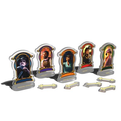 Tout comme l'année dernière, l'expérience Arkham Nights de cette année est mondiale. Les magasins de jeux du monde entier peuvent utiliser le kit officiel Arkham Nights 2024 Organized Play pour soutenir un événement célébrant Arkham Horror comme bon leur semble. Chaque kit peut accueillir jusqu'à 4 joueurs, et plusieurs kits peuvent être utilisés pour un plus grand nombre de participants. Pour Arkham Horror: The Card Game, 2024 a commencé avec la sortie de The Feast of Hemlock Vale. Maintenant, à l'approche de la fin de l'année, il est tout à fait approprié que le kit Arkham Nights propose quelques promos autour de cette fantastique vague de contenu. Le kit contient quatre ensembles de figurines acryliques des investigateurs de The Feast of Hemlock Vale, y compris Wilson Richards, Kate Winthrop, Alesandra Zorzi, Kohaku Narukami et Hank Samson. Ces figurines sont d'excellentes alternatives aux mini-cartes d'investigateur lors d'une campagne, et elles sont même livrées avec quelques « jetons de connexion de lieu » que vous pouvez utiliser comme références pratiques pendant une partie. En plus des ensembles de figurines et des jetons de liaison, le kit comprend également huit* sous-verres en carton sur le thème des différents commerces d'Arkham, dans le Massachusetts. Parmi ces commerces, on trouve le Clover Club, l'hôtel Excelsior, La Bella Luna et la salle de danse The Diamond Dog, pour n'en citer que quelques-uns. Que vous utilisiez ces sous-verres pour poser vos boissons pendant vos soirées de jeu ou simplement pour les exposer comme décoration, tout fan de la franchise Arkham Horror Files voudra en obtenir quelques-uns !