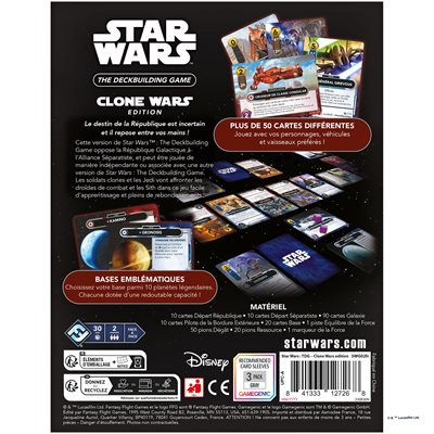 Dans l'édition Clone Wars de Star Wars™ : The Deckbuilding Game, la guerre à l'échelle de la galaxie entre la République Galactique et la Confédération Séparatiste prend vie sur votre table de jeu. Dans ce jeu facile à apprendre, vous et votre adversaire choisissez chacun un camp, incarnant soit la République, soit les Séparatistes, et au fur et à mesure que la partie progresse, vous renforcez tous deux la puissance de vos decks de départ et vous vous efforcez de détruire les bases de l'autre. Le premier joueur à détruire trois bases de son adversaire remporte la partie !