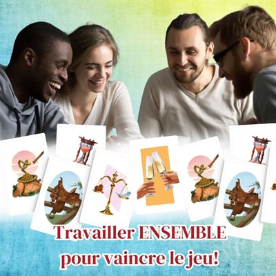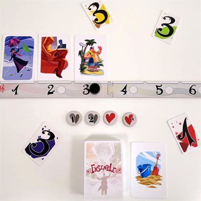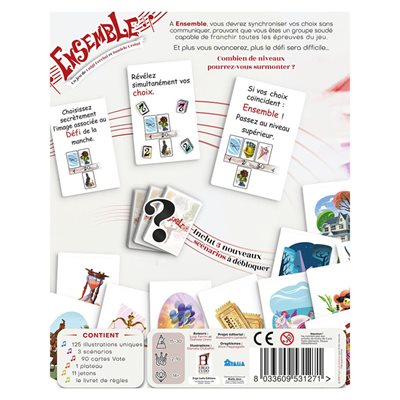 À chaque manche du jeu Ensemble, chaque joueur désigne secrètement la carte Souvenir du plateau qui, selon lui, se combine le mieux avec la carte Défi placée au centre de la table. Plus on avance dans la partie et plus il y a de cartes Souvenir parmi lesquelles choisir. Le groupe à autant de jetons Vie qu’il y a de joueurs. Certains de ces jetons offrent une tolérance (le droit de ne pas être tout à fait unanimes). Pour gagner, il faut atteindre le niveau 9 avant d’avoir épuisé les jetons Vie.