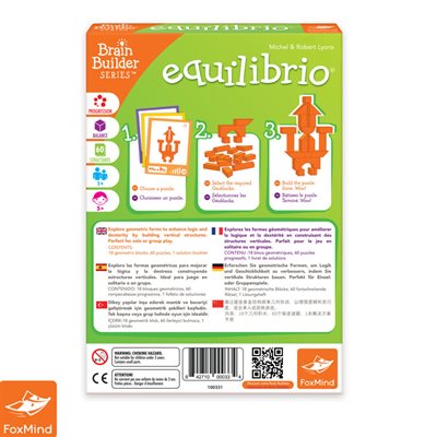 Les joueurs ont besoin de dextérité, d’ingéniosité et de persévérance pour réussir à construire d’étonnantes structures verticales. D’ailleurs, certaines structures peuvent paraître impossible à réaliser, mais avec un peu de planification, une touche de logique et de la ténacité, vous réussirez à les terminer avec toute la satisfaction et la joie qu’un tel accomplissement peut apporter. Equilibrio fait partie de la ligne Brain Builder qui comprend 4 jeux de visualisation spatiale où les joueurs progressent à leur rythme à travers une série de puzzles qui deviennent de plus en plus difficiles. Les jeux comprennent le même ensemble de Geoblocks et un livret de puzzle séparé en 6 niveaux de difficulté.