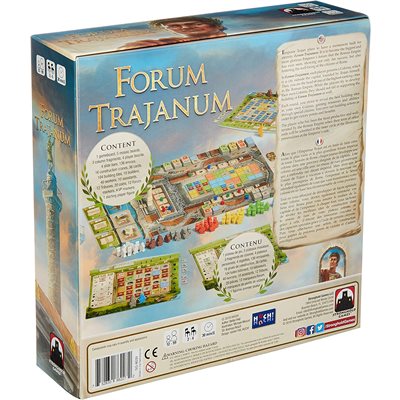 In Forum Trajanum, each player governs a Colonia, founded by Trajan himself, and thus is the head of one of the highest-ranking cities in the entire Roman Empire. While the players try to optimally develop their own Colonia, they should not fail in supporting the Emperor's building project to the best of their abilities at the same time. The player who is most successful in doing so will — after expiry of their term of office — be admitted to the small circle of illustrious and mighty personalities surrounding the Emperor.