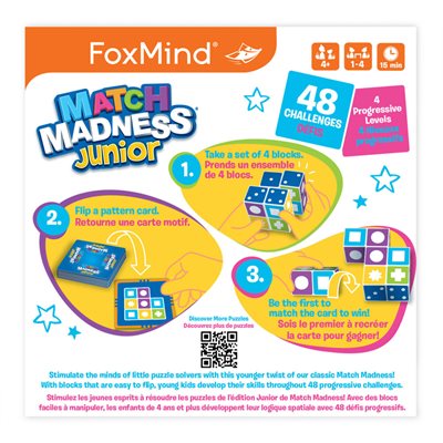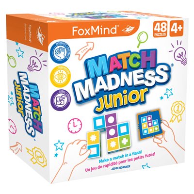 Les joueurs, dès l’âge de 4 ans, s’amuseront avec les puzzles ingénieux et la rapidité enlevante de Match Madness Junior! Ils développeront leur observation, leur dextérité et leur logique en recréant des motifs. Match Madness Junior s’avère un excellent jeu solitaire et une expérience de jeu amusante en famille!