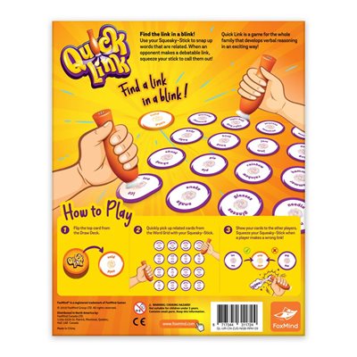 Quick Link est un jeu d’ambiance pour toute la famille, où les joueurs utilisent des bâtons avec des ventouses pour attraper des mots. Si un adversaire fait une correspondance douteuse, presse ton bâtonnet pour le contester !Ce jeu développe le raisonnement verbal et enseigne la gestion des conflits de manière ludique et dynamique.Sauras-tu trouver le lien en un clin d’œil ?
