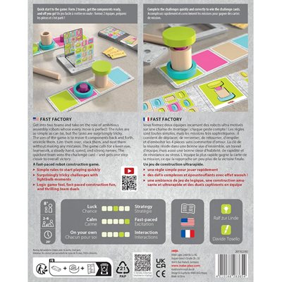 Dans ce jeu familial amusant, les joueurs incarnent des robots d'assemblage ambitieux, testant leur travail d'équipe et leur dextérité ! Fast Factory est un jeu d'assemblage rapide, facile à apprendre mais rempli de tâches difficiles à maîtriser.