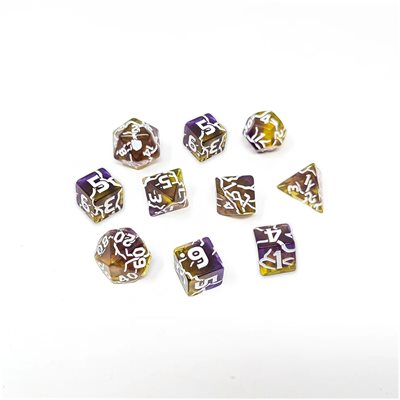 Clear yellow resin dice with a cursed purple smoke and cursed magic lines.