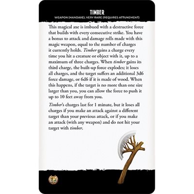 The Deck of Many and The Griffon’s Saddlebag team up to produce 50 illustrated cards from the Saddlebag’s growing collection of inventive new items. These uniquely niche-filling weapons and items are flavorful, balanced, and ready for you and your players to enjoy.