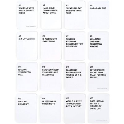 Contient les mêmes cartes que le jeu "Qui est le plus susceptible de...".