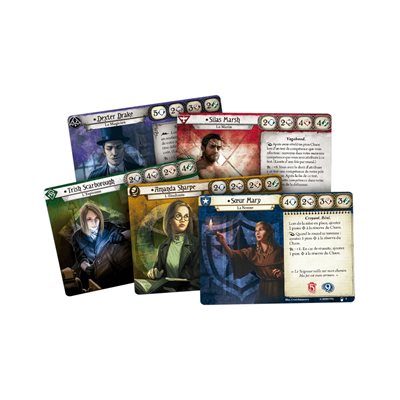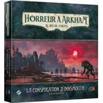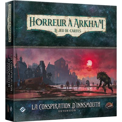 Non loin d’Arkham, l’ancien port de pêche d’Innsmouth se dresse sur la côte Atlantique. Une aura de décrépitude et de décadence y plane, tel un brouillard sur l’océan. Elle émane des fenêtres étrangement rougeoyantes de la Maison Gilman, des ponts de bois rudimentaires et des entrepôts de Fish Street. Au-delà des limites de la ville, le littoral d’Innsmouth est troué de grottes et de cavernes à moitié inondées, formant des criques artificielles. Qui sait quels étranges bibelots vous pourriez trouver en cherchant parmi les poissons morts et les algues pourrissantes? La Conspiration d’Innsmouth vous invite à faire vos premiers pas dans une troublante chronique, grâce aux deux premiers scénarios de la campagne, inclus dans cette extension. Du cœur de la ville à son littoral tortueux et au-delà, ces scénarios sont le début d’une longue histoire qui se continuera dans les six Paquets suivants. Cette boîte introduit également cinq nouveaux Investigateurs et de nouvelles cartes Joueur pour concevoir de nouveaux decks. De nouvelles mécaniques, qui donneront du fil à retordre aux joueurs, sont également au programme, comme les Clés, les Pions Inondations, ainsi que les Pions Béni et Maudit!