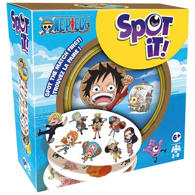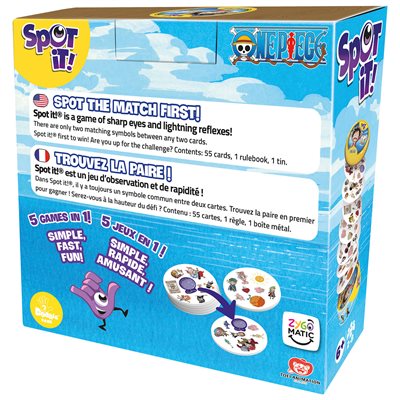 Spot it! One Piece est une édition thématique du célèbre jeu d’observation qui met votre vitesse et vos réflexes à l’épreuve. Comme dans l’original, il y a toujours un – et un seul – symbole correspondant entre deux cartes quelconques. Avec des illustrations sur le thème de One Piece, le jeu conserve le même gameplay rapide et amusant adoré par des millions de personnes. Facile à porter, rapide à jouer, et infiniment rejouable - Spot it! One Piece est parfait pour se lancer dans de nouvelles aventures.