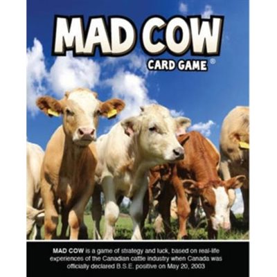 MAD COW is a card game of strategy and luck, based on real-life experiences of the Canadian cattle industry when Canada was officially declared B.S.E. positive on May 20, 2003. Keep your region free from BSE and win big points! With strategic moves, BSE surveillance, and old fashioned farmer's luck, you can run a successful cattle operation.