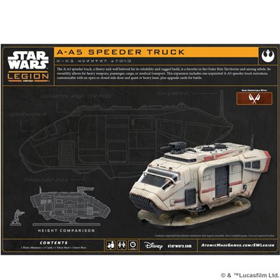 Cette extension pour Star Wars : Legion contient 1 figurine de camion A-A5 Speeder Truck finement sculptée, assez pour 1 unité lourde, ainsi que de nouvelles cartes d’unité et d’amélioration à aligner au combat.