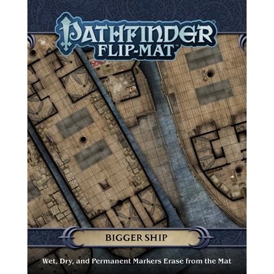 Whether smuggling cargo, boarding and plundering a prize, or sailing in style, the possibilities for adventure are endless with Pathfinder Flip-Mat: Bigger Ship. With an area that's 45% larger than Pathfinder Flip-Mat: Warship at their disposal, Game Masters can now dream even bigger! This massive gaming accessory presents multiple decks of a richly appointed galleon, which could be home to common sailors, naval officers, and nobles on royal business—and targeted by enemy navies, pirates, or monsters from the deep!