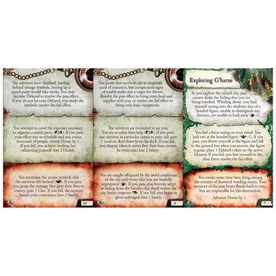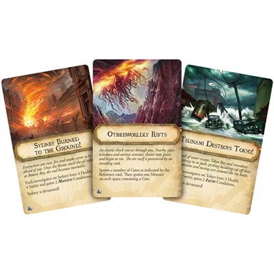 Cities in Ruin apporte quatre nouveaux enquêteurs, ainsi qu’une multitude de nouvelles cartes Monstre et Rencontre à l’univers d’Eldritch Horror. La présence du nouvel Ancien, Shudde M’ell, apporte une tournure destructrice au jeu sous la forme de catastrophes mortelles.