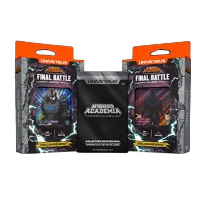 La bataille finale est lancée. Choisissez votre camp.My Hero Academia : Final Battle fait revivre l'intensité de l'anime sur UniVersus avec deux decks prêts à jouer de la série Challenger mettant en scène Armored All Might et Deku et All For One et Shigaraki.