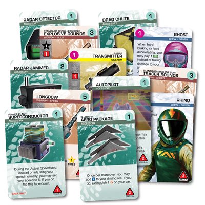 This single-player expansion comes with 45 cards originally found in Uncle Al's Upgrade Pack (but not the checkpoint cards). Customize your vehicle, including unique weapons, accessories, crew, upgrades, and more! Heat things up with a Fire-Resistant Coating, then use the Turreted Heavy Rocket to stop your opponents in their tracks. Need help making a precise shot? Add the Steady-Aim Gimbal to your arsenal for some extra edge.