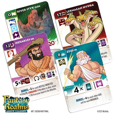 Fantasy Realms: Greek Legends takes this now classic formula, and adds some new mechanical twists to match its theme. It features attribute tags, iconographic scoring condition reminders, and all-new graphic design and illustrations!