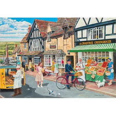 The perfect morning in the village high street with the villagers getting on with their daily tasks. You can almost smell the freshly baked bread, about to be delivered by the baker. And don’t the fruit in the greengrocer’s stall look luscious?! There is, however, always time for a little chitchat when postman Ben comes past on his shiny bike.