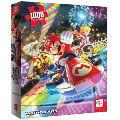 Glowing, galactic, and in-your-face with all its gradient glory, Rainbow Road is a track to remember for Mario Kart fans with this 1,000-piece jigsaw puzzle featuring the topsy-turvy mainstay from Nintendo’s classic racing game. Catch Princess Peach bearing a Bob-omb as Bowser catches up to Mario among other popping details in this fluorescent 19"x27" puzzle.