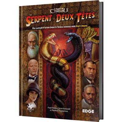 Le Serpent à Deux Têtes est une campagne épique et explosive, débordant de péripéties et se déroulant dans le Cthulhu Pulp des années 30. Les investigateurs se confrontent aux manigances sinistres d’une ancienne race de monstres décidée à régner sur un monde qui était autrefois le leur. Les héros, en travaillant pour Caducée, une ONG médicale, fouilleront un temple perdu dans les forêts de Bolivie, tiendront tête à la Mafia de New York, risqueront leur vie durant une épidémie mortelle dans les jungles de Bornéo, et exposeront au grand jour les plans d’un culte étrange dans le dust-bowl de l’Oklahoma. Ils devront aussi infiltrer le territoire de leurs ennemis au cœur d’un volcan grondant en Islande, être témoins d’abominables expérimentations médicales au Congo, jouer contre la montre pour s’emparer d’un objet magique ancien et puissant dans les rues de Calcutta, et, enfin, voyager jusqu’à un continent perdu pour y mener une bataille désespérée : sauver l’humanité de l’esclavage et de l’annihilation !