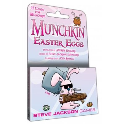 Munchkin Easter Eggs is a 15-card booster that contains Munchkin cards with an Easter theme. The seven Treasures and eight Doors included have the standard Munchkin card backs, but the card fronts use a different color scheme: the Treasures have a green border and a yellowish background, while the Doors have a light blue border with a red and white background. (There's some sort of pattern/image to the background.)