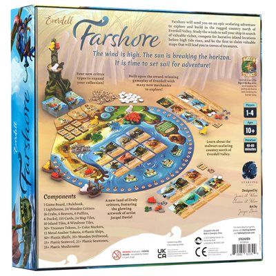Welcome to Everdell Farshore, a standalone game set in the country of Farshore. Through each season, you lead a crew of critter workers to build up a prosperous city and to explore the enchanting ocean beyond. You must plan your actions carefully in order to build and to sail, for only by adapting to the winds of change will you succeed.