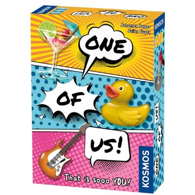 Un jeu de société coopératif de conjectures et de rires. À qui pensez-vous lorsque vous voyez un chat ? Qui porterait le mieux une combinaison de parachute casse-cou ? Et qui d’entre vous préférerait disparaître sur une île déserte ? Dans One of Us, vous devez vous mettre d’accord sur le joueur que vous associez le plus à la carte que vous venez de retourner, et sans en discuter ! Si la majorité pointe vers la même personne, vous marquez un point. Parviendrez-vous à être sur la même longueur d’onde et à marquer dix points ? Rapide et facile à apprendre et à enseigner, tout le monde peut se lancer et commencer à jouer immédiatement
