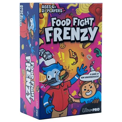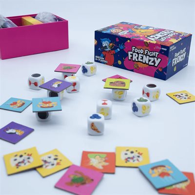 Food Fight Frenzy est un jeu de lancer de dés, de vitesse et de dextérité. Chaque joueur dispose d’une pile de tuiles et commence avec 5 tuiles face visible. Au tour d’un joueur, il lance tous les dés et dit « Go ». Puis c’est une course folle où tous les joueurs essaient de placer leurs tuiles face visible sur les dés correspondants.Une fois qu’un joueur n’a plus de tuiles correspondant à des dés non découverts, il peut dire « Stop » et la manche se termine. Fais attention cependant, si tu cries stop trop tôt ou si une de tes tuiles tombe du dé, tu es éliminé du tour.Continuez ainsi jusqu’à ce qu’un joueur se débarrasse de toutes ses tuiles et gagne.