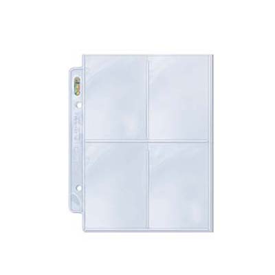 Ultra PRO Platinum Hologram Pages in four-pocket mini-album style. Archival quality pages that holds standard-sized cards with 2-1/2" X 3-1/2" dimensions or smaller. Also ideal for sticker cards, coupons and other collectibles. Pages are clear on both sides and fit in mini two-ring albums. (214D) • Hologram quality seal on spine • Acid-Free and No PVC • UV protection • High clarity material • Lays flat • Toploading • Made in U.S.A. • High-strength Seal • Pre-punched 2-hole spine for mini-albums • 100 pages per display box